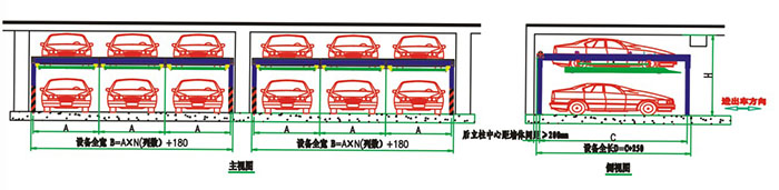 运行原理 该设备充分利用空间,一个车位能停两辆车。上面层载车板可上下升降:地面层无载车板,地面层车开出后,上方的载车板下降到地面层,完成存取过程。 特点 ●对有限的停车空间,可双倍停放车辆,可节省大量